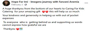 We want to say a MASSIVE thank you to the team at CARING FOR KIDS CATERING INC for their amazing donation to help us over the next month. We can't thank them enough for their generous donation. Please go check out their brand new website and if you are looking for a charity to support please consider these guys. They are helping children like Sienna and their families in tough times. |